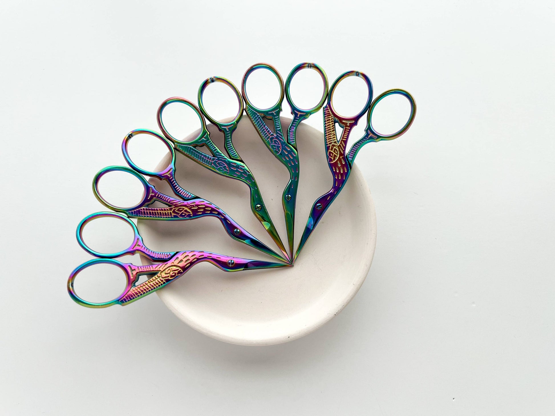 Small needlecraft scissors featuring a popular stork design are perfect for various needlework uses such as: embroidery, cross stitch, sewing, quilting, crochet, knitting and more. FEATURES: - Length: 3.75 in / 93 mm - Stainless steel with no-chip plasma coating - Sharp tips for clean cuts