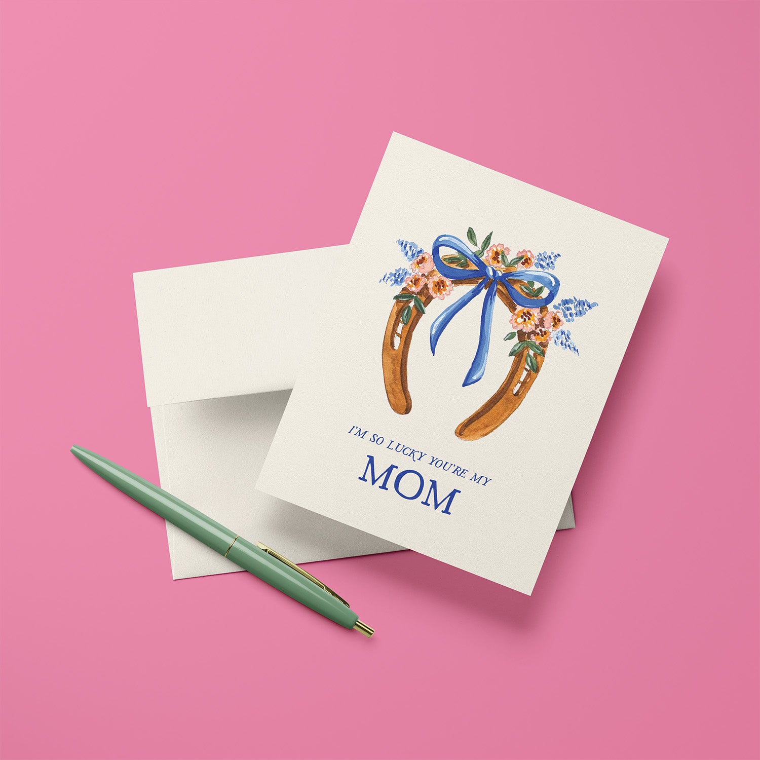 Let Mom know how lucky you feel with our Horseshoe Mother’s Day greeting card. This floral horseshoe design includes the sweet message “I’m so lucky you’re my mom.” A perfect way to share your love and gratitude. Blank inside.