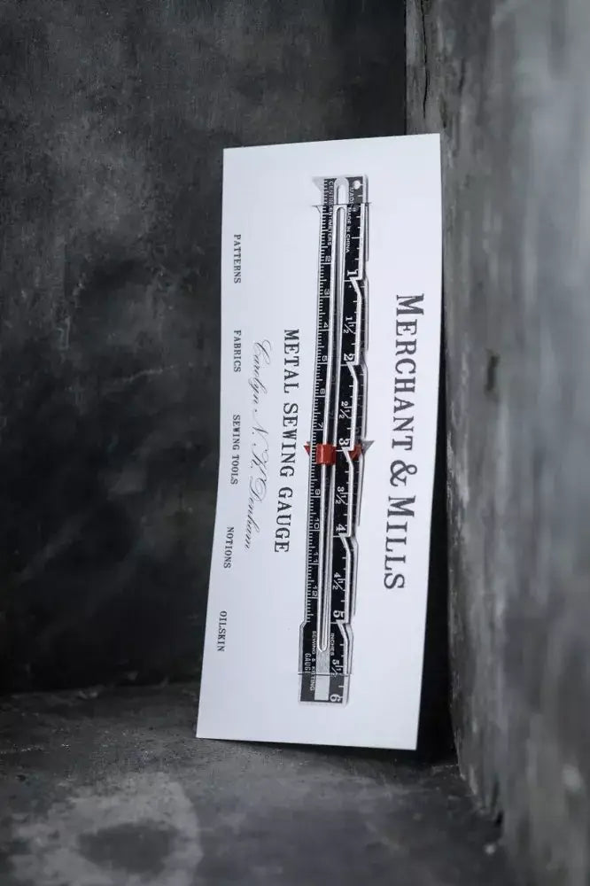 A metal gauge with sliding pointer for hem and seam allowance consistency.